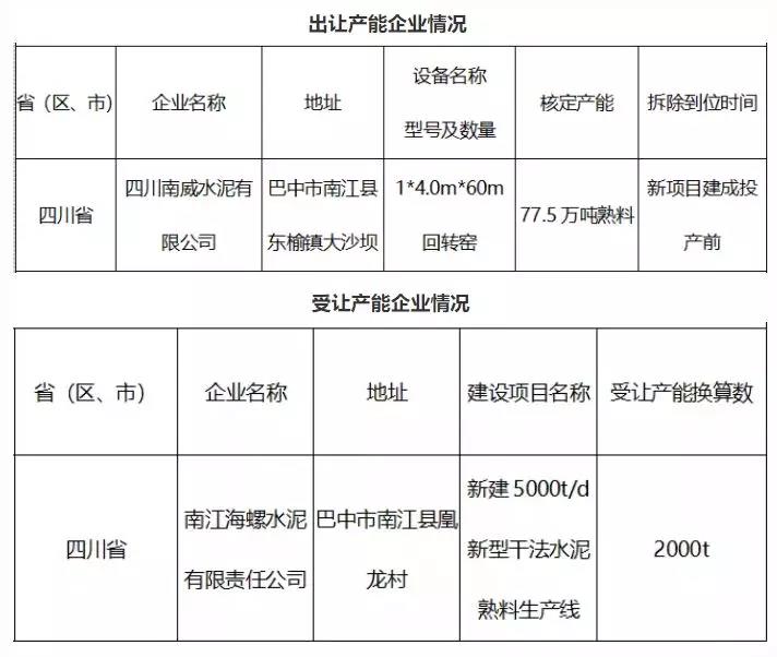 日前,四川省巴中市經(jīng)信委發(fā)布《四川南威水泥有限公司產(chǎn)能出讓公告》稱(chēng),四川南威水泥有限公司產(chǎn)能將出讓77.5萬(wàn)噸熟料產(chǎn)能給南江海螺新建5000噸/日熟料生產(chǎn)線(xiàn)。