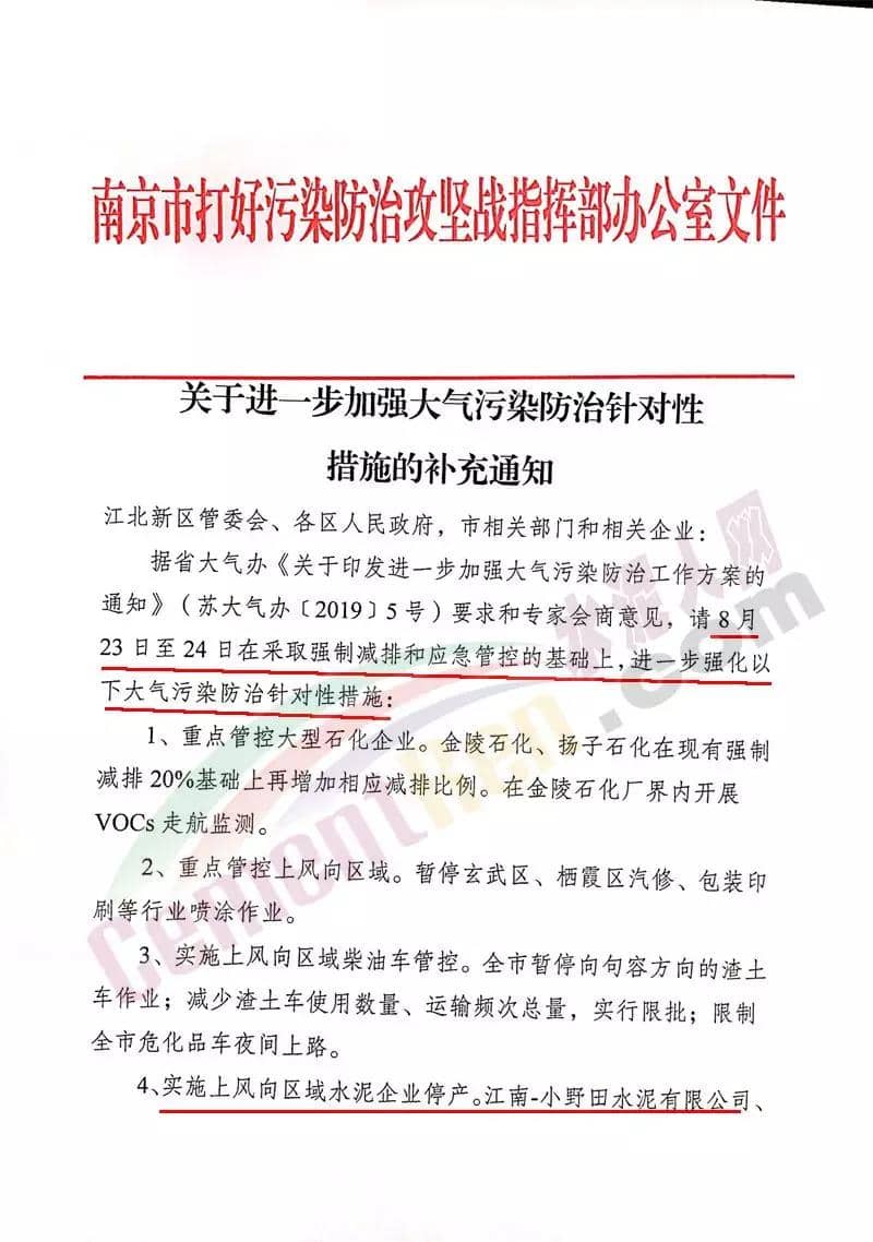 據(jù)水泥人網(wǎng)了解,就在前一日(8月22日),南京市打好污染防治攻堅(jiān)戰(zhàn)指揮部辦公室發(fā)布《關(guān)于繼續(xù)采取有效措施應(yīng)對(duì)大氣污染過(guò)程的通知 》稱據(jù)省大氣辦通知,經(jīng)省環(huán)境監(jiān)測(cè)中心、省氣象臺(tái)預(yù)測(cè),8月23日至24日,受不利氣象條件影響,市空氣質(zhì)量持續(xù)惡化,臭氧8小時(shí)滑動(dòng)平均濃度將超過(guò)148微克/立方米。根據(jù)省大氣辦《關(guān)于印發(fā)進(jìn)一步加在氣污染防治工作方案的通知》要要求,請(qǐng)各板塊在做好民生保障和安全生產(chǎn)基礎(chǔ)上實(shí)施強(qiáng)制減排,從22日起繼續(xù)執(zhí)行II級(jí)應(yīng)急管控至24日,努力實(shí)現(xiàn)臭氧污染“縮時(shí)削峰”。省、市兩級(jí)將對(duì)強(qiáng)化管控措施落實(shí)情況進(jìn)行督查。