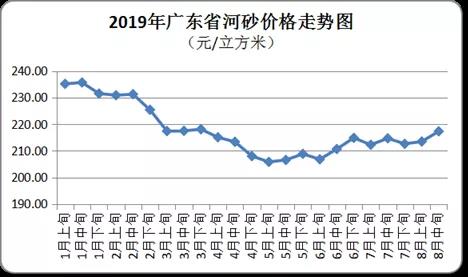 8月中旬,全省河砂平均購進價為每立方米217元,環(huán)比上升1.8%(與2019年8月上旬相比,下同)。其中,粵西和珠三角地區(qū)購進價漲幅較大,均價分別為每立方米220元和200元,環(huán)比分別上升3.53%和3.61%。