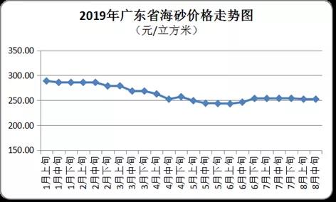 4、海砂價格環(huán)比持平 8月中旬全省海砂(淡化處理)平均購進價為每立方米252元,價格維持不變。其中,粵北和珠三角地區(qū)購進價分別為每立方米225元和272元。