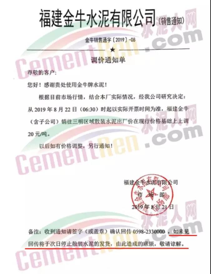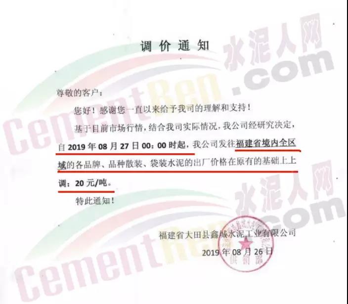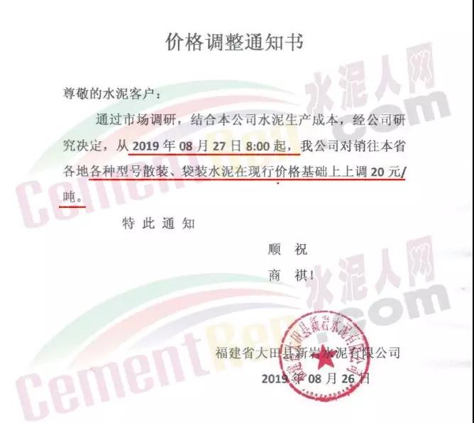 8月26日。福建省謀成水泥發(fā)展有限公司發(fā)布調(diào)價(jià)通知稱:根據(jù)目前市場行情,經(jīng)公司研究決定,自2019年8月27日零時(shí)起,我司各品種袋裝、散裝水泥出廠單價(jià)在原有基礎(chǔ)上上調(diào)20元/噸,本次調(diào)價(jià)為謀成水泥8月份的第二調(diào)價(jià),累計(jì)上調(diào)40元/噸。