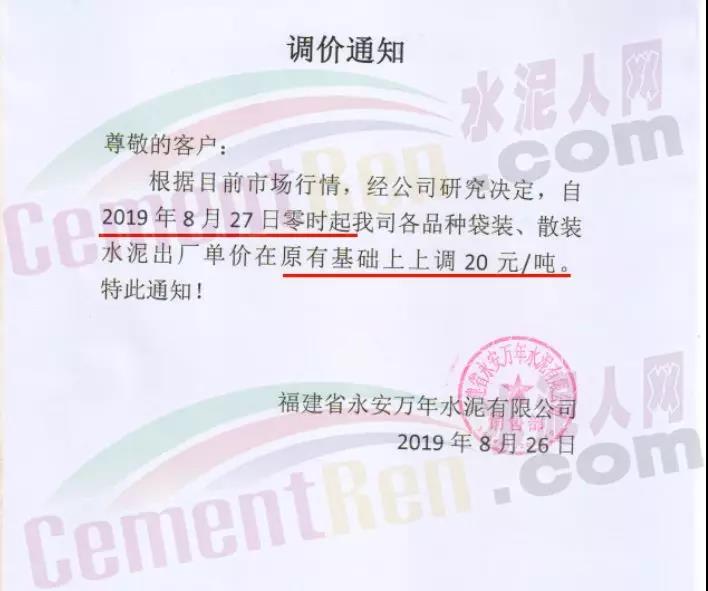 8月26日,福建省永安萬年水泥有限公司發(fā)布調(diào)價(jià)通知稱:根據(jù)目前市場行情,經(jīng)公司研究決定,自2019年8月27日零時(shí)起我司各品種袋裝、散裝水泥出廠單價(jià)在原有基礎(chǔ)上上調(diào)20元/噸。這是福建永安萬年水泥8月份第二次提價(jià),累計(jì)上調(diào)40元/噸。