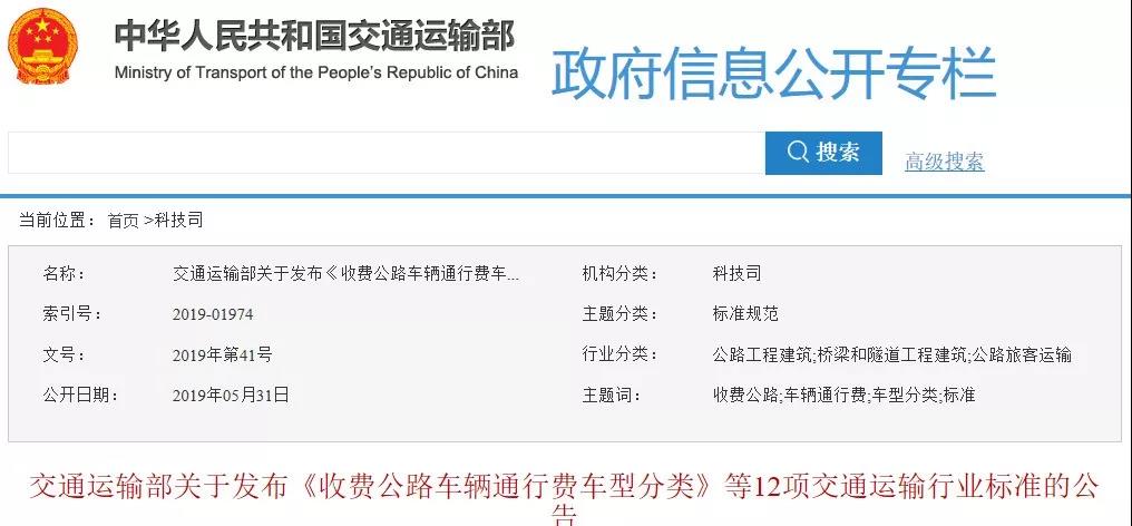 關(guān)于《收費公路車輛通行費車型分類》行業(yè)標(biāo)準(zhǔn)的實施時間方面,交通運(yùn)輸部文件附件明確實施日期:2019年9月1日。