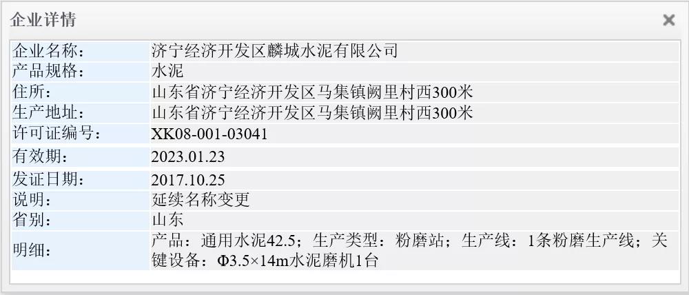 市場監(jiān)管總局生產許可證辦公室數據顯示,濟寧經濟開發(fā)區(qū)麟城水泥有限公司生產地址位于山東省濟寧經濟開發(fā)區(qū)馬集鎮(zhèn)闕里村西300米。企業(yè)擁有一條水泥粉磨生產線,其關鍵設備為Φ3.5×14m水泥磨機1臺。