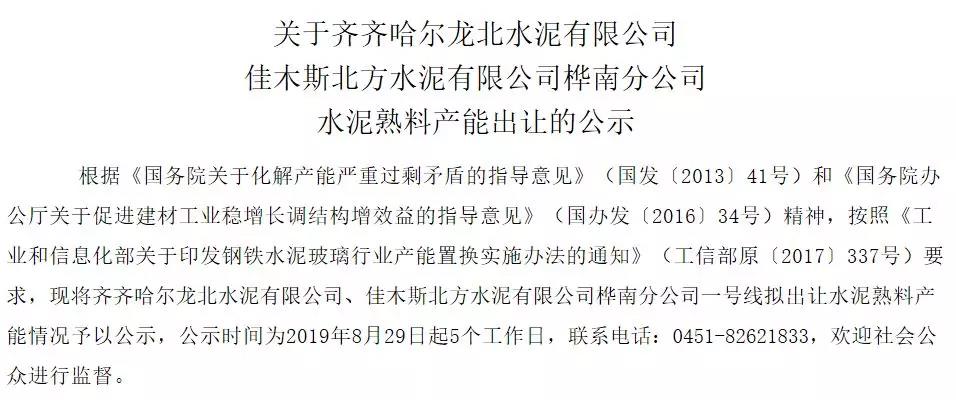 水泥人網(wǎng)消息:日前,黑龍江省工信廳發(fā)布《關(guān)于齊齊哈爾龍北水泥有限公司佳木斯北方水泥有限公司樺南分公司水泥熟料產(chǎn)能出讓的公示》稱:根據(jù)《國(guó)務(wù)院關(guān)于化解產(chǎn)能嚴(yán)重過(guò)剩矛盾的指導(dǎo)意見(jiàn)》(國(guó)發(fā)〔2013〕41號(hào))和《國(guó)務(wù)院辦公廳關(guān)于促進(jìn)建材工業(yè)穩(wěn)增長(zhǎng)調(diào)結(jié)構(gòu)增效益的指導(dǎo)意見(jiàn)》(國(guó)辦發(fā)〔2016〕34號(hào))精神,按照《工業(yè)和信息化部關(guān)于印發(fā)鋼鐵水泥玻璃行業(yè)產(chǎn)能置換實(shí)施辦法的通知》(工信部原〔2017〕337號(hào))要求,將齊齊哈爾龍北水泥有限公司、佳木斯北方水泥有限公司樺南分公司一號(hào)線擬出讓水泥熟料產(chǎn)能情況予以公示。