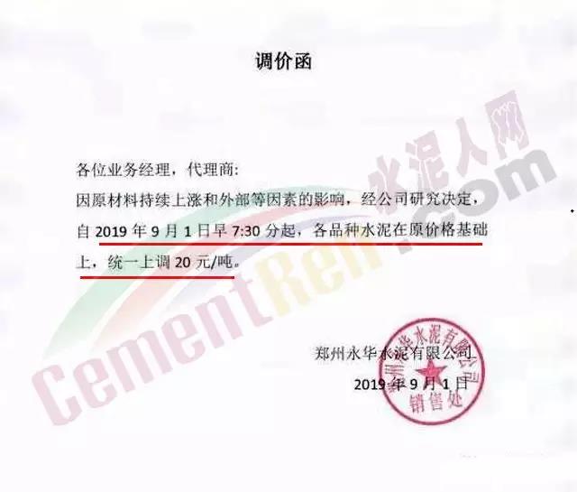 鄭州永華水泥有限公司發(fā)布調(diào)價函稱因原材料持續(xù)上漲和外部等因素影響,經(jīng)公司研究決定,自2019年9月1日7:30起,各品種水泥在原價格基礎(chǔ)上,統(tǒng)一上調(diào)20元/噸。