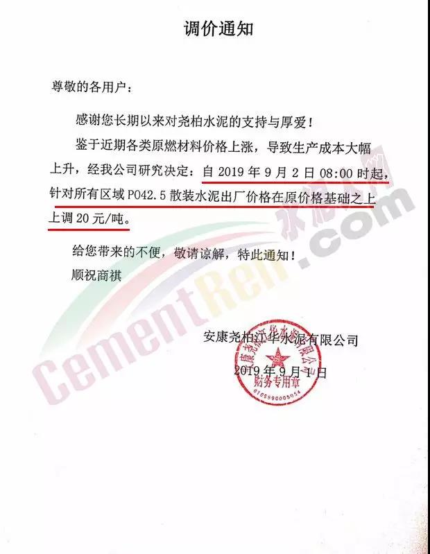 鄭州順寶水泥股份有限公司調(diào)價函稱:因原材料持續(xù)上漲和外部等因素影響,經(jīng)公司研究決定,自2019年9月1日7:30起,各品種水泥在原價格基礎(chǔ)上,統(tǒng)一上調(diào)20元/噸。