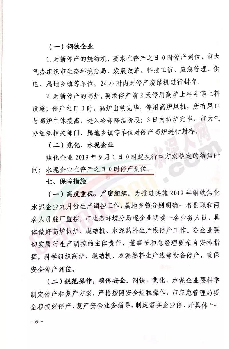 9月28日0時(shí)至10月4日24時(shí),水泥熟料行業(yè)。耀東水泥按照城市污泥實(shí)際處置量保持最低負(fù)荷生產(chǎn)。全縣范圍的獨(dú)立石灰窯、粉磨站、磚瓦窯、鑄造、獨(dú)立軋鋼(含冷軋)企業(yè)停產(chǎn)。管控原則:允許生產(chǎn)的鋼鐵、焦化、水泥企業(yè)必須超低排放,其他工業(yè)企業(yè)必須達(dá)標(biāo)排放。保障措施:鋼鐵、焦化、水泥等重點(diǎn)企業(yè)通過縣電視臺(tái)向社會(huì)公開9月份限產(chǎn)減排承諾。