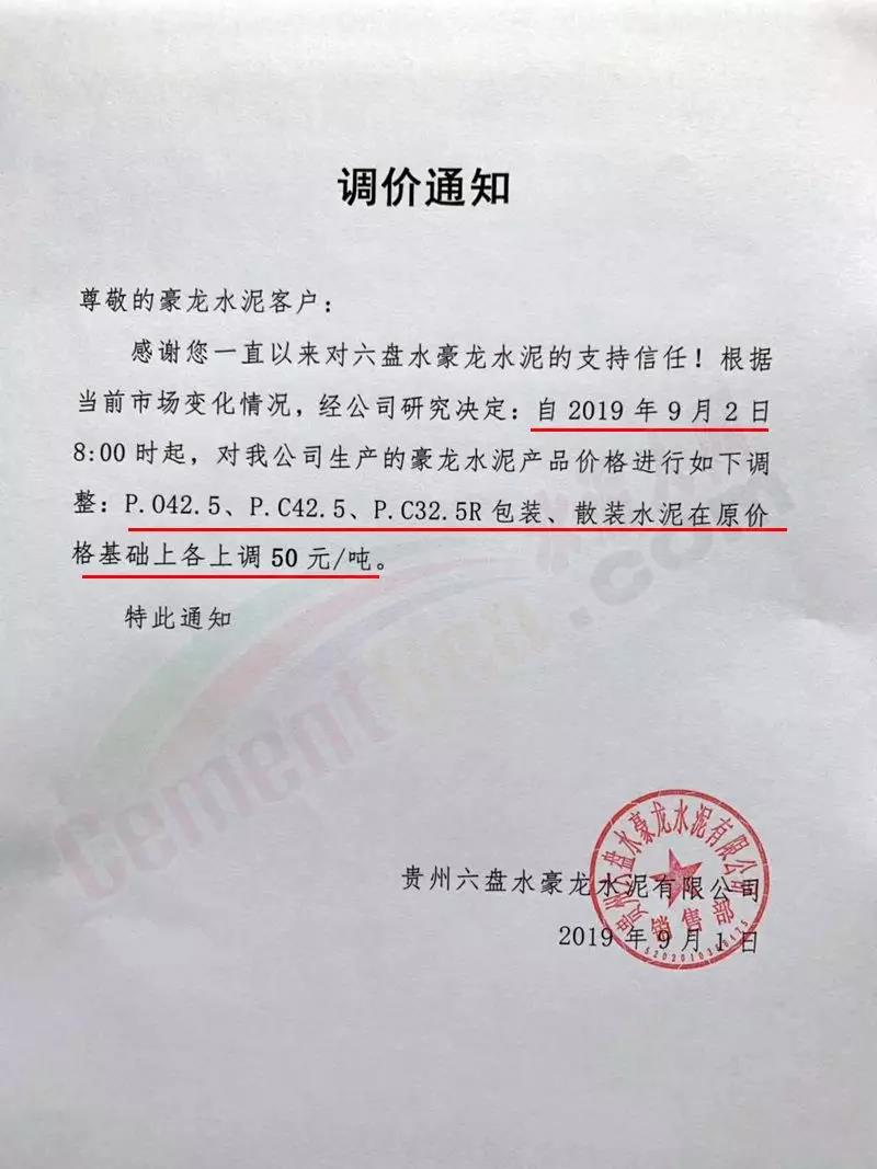 貴州六盤水豪龍水泥有限公司調(diào)價通知稱根據(jù)市場變化自9月2日8時起上調(diào)水泥價格,上調(diào)幅度50元/噸。
