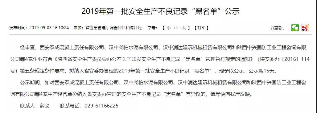 日前,陜西省應(yīng)急管理廳發(fā)布《2019年第一批安全生產(chǎn)不良記錄“黑名單”公示》稱,經(jīng)審查,西安泰成混凝土責(zé)任有限公司、漢中堯柏水泥有限公司、漢中潤(rùn)達(dá)建筑機(jī)械租賃有限公司和陜西中興國(guó)防工業(yè)工程咨詢有限公司等4家企業(yè)符合《陜西省安全生產(chǎn)委員會(huì)辦公室關(guān)于印發(fā)安全生產(chǎn)不良記錄“黑名單”管理暫行規(guī)定的通知》(陜安委辦〔2016〕114號(hào))第五條規(guī)定條件要求,擬納入省安委辦管理的2019年第一批安全生產(chǎn)不良記錄“黑名單”,予以公示,公示期15天。