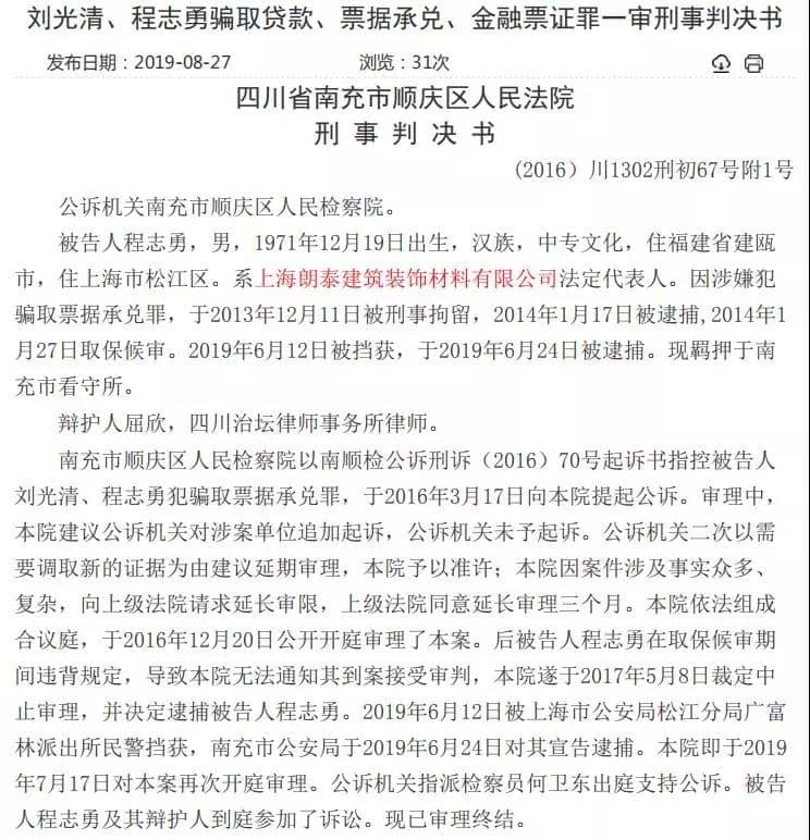 隨后南充市公安局以劉某清、程某勇等人涉嫌犯騙取票據(jù)承兌罪立案。判決書顯示,至2016年12月20日,郎泰公司尚欠本金185.36萬元,但程某勇的多出資產(chǎn)已被查封。