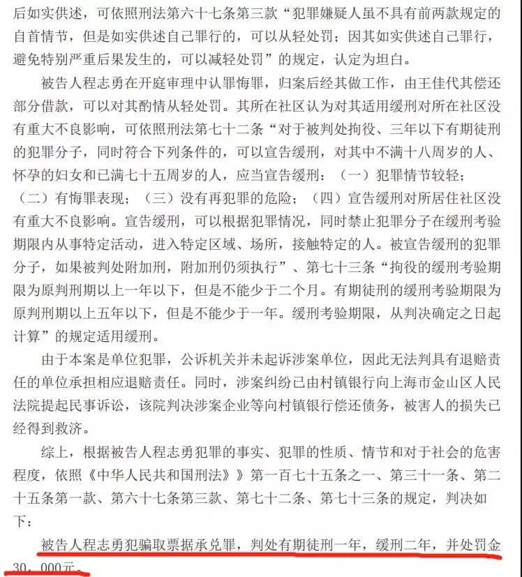 最終,南充市順慶區(qū)人民法院判處程某勇犯騙取票據(jù)承兌罪,判處其有期徒刑1年,緩刑2年,并處罰金3萬元。