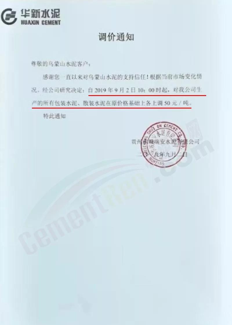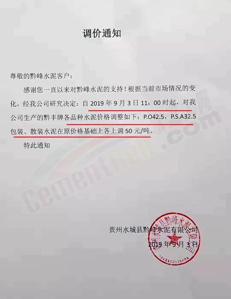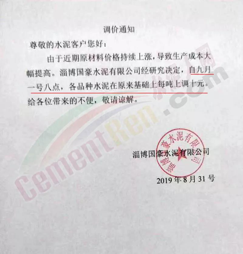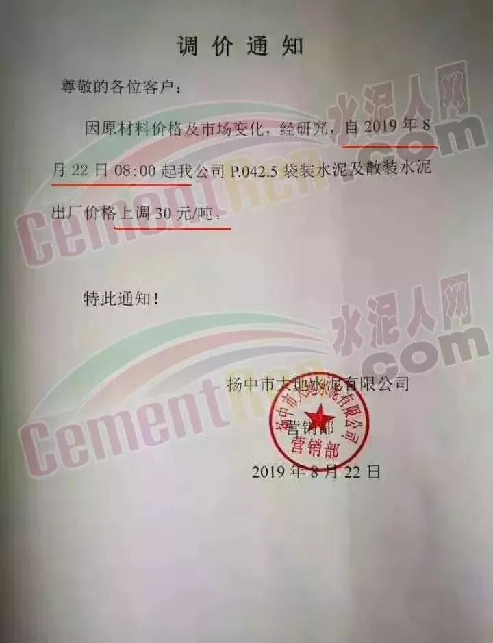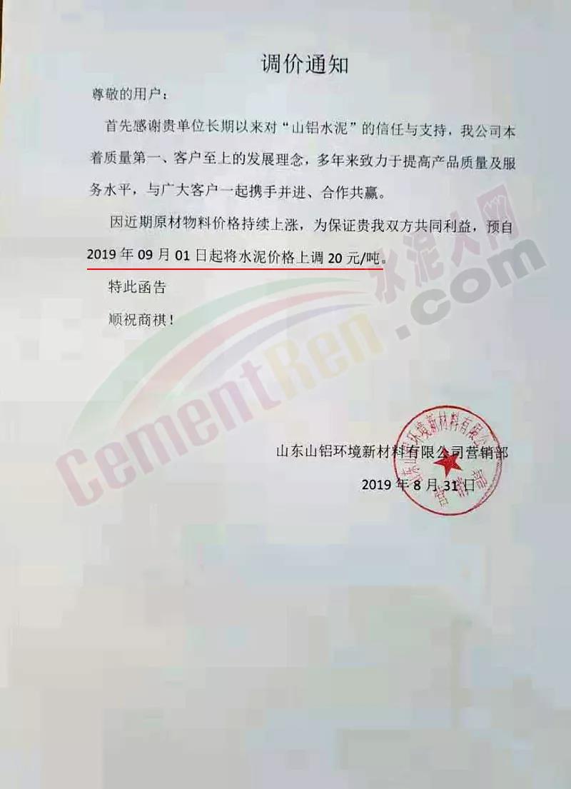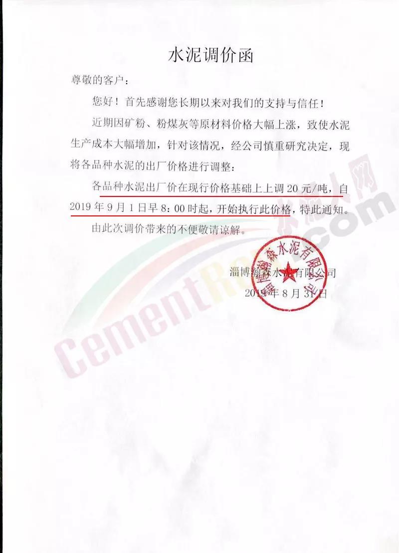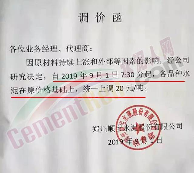 鄭州順寶水泥股份有限公司調(diào)價(jià)函稱:因原材料持續(xù)上漲和外部等因素影響,經(jīng)公司研究決定,自2019年9月1日7:30起,各品種水泥在原價(jià)格基礎(chǔ)上,統(tǒng)一上調(diào)20元/噸。