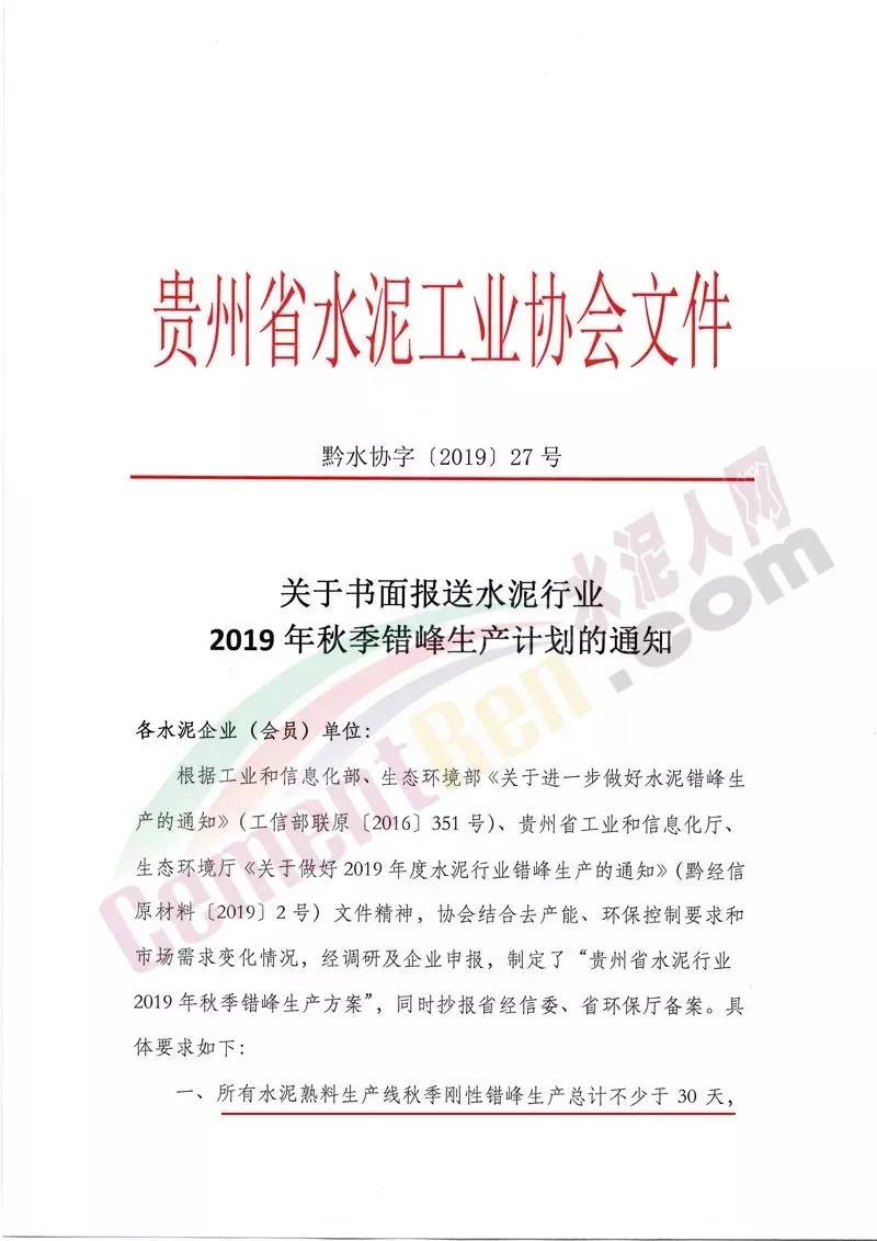 就在上個(gè)月初,由于貴州地區(qū)水泥價(jià)格一直低位運(yùn)行,水泥出廠價(jià)格低至200元/噸以下,當(dāng)?shù)孛耖g就傳出未來一個(gè)月貴州地區(qū)水泥價(jià)格將整體上漲100元/噸,價(jià)格調(diào)整到300元/噸,隨后不久貴州省水泥工業(yè)協(xié)會印發(fā)了“2019年秋季錯(cuò)峰生產(chǎn)方案”,要求所有水泥熟料生產(chǎn)線秋季剛性錯(cuò)峰生產(chǎn)總計(jì)不少于30天,原則上每月錯(cuò)峰生產(chǎn)10天每窯。