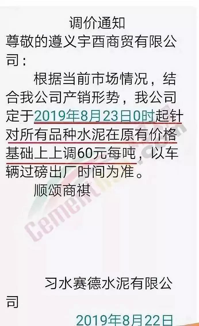 因近期原燃材料成本上漲,我公司現(xiàn)決定于2019年8月22日8:00針對PO42.5散裝價(jià)格進(jìn)行調(diào)整,價(jià)格上調(diào)60元/噸。
