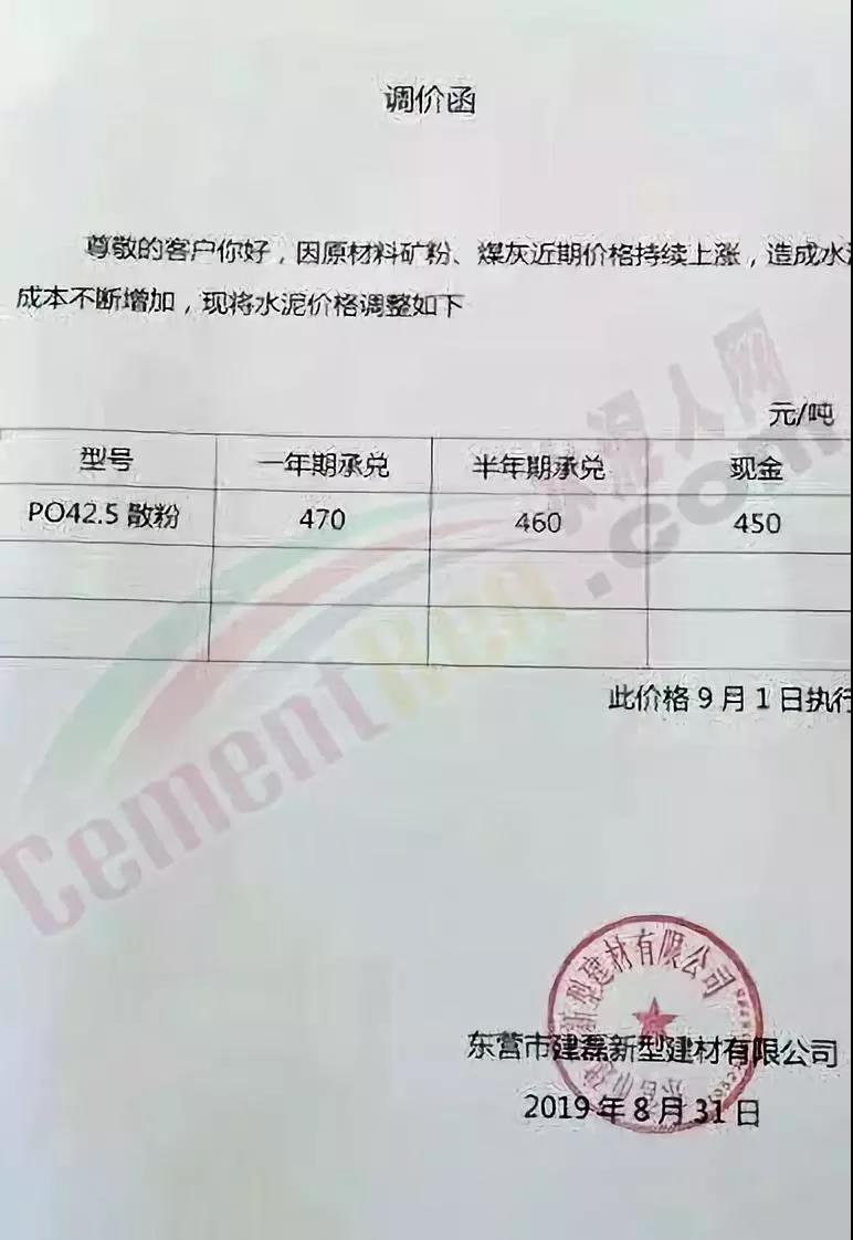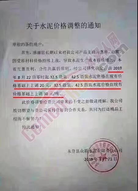 鄭州永華水泥有限公司發(fā)布調(diào)價(jià)函稱因原材料持續(xù)上漲和外部等因素影響,經(jīng)公司研究決定,自2019年9月1日7:30起,各品種水泥在原價(jià)格基礎(chǔ)上,統(tǒng)一上調(diào)20元/噸。