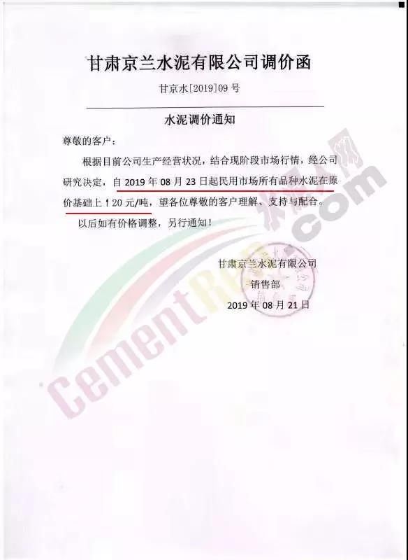 甘肅京蘭水泥有限公司調(diào)價(jià)函稱,自8月23日起民用市場所有品種水泥在原價(jià)基礎(chǔ)上上調(diào)20元/噸。