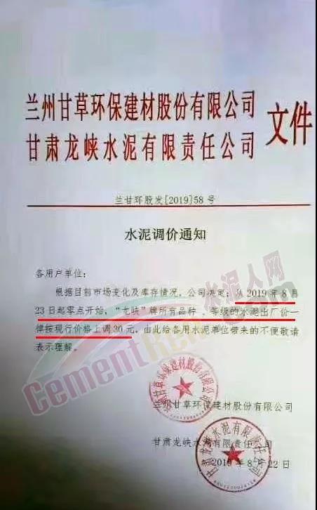 中材甘肅水泥有限責(zé)任公司《關(guān)于調(diào)整水泥銷售價(jià)格的通知》稱自2019年8月22日零時(shí)起對各品種水泥在現(xiàn)有價(jià)格基礎(chǔ)上上調(diào)30元/噸。