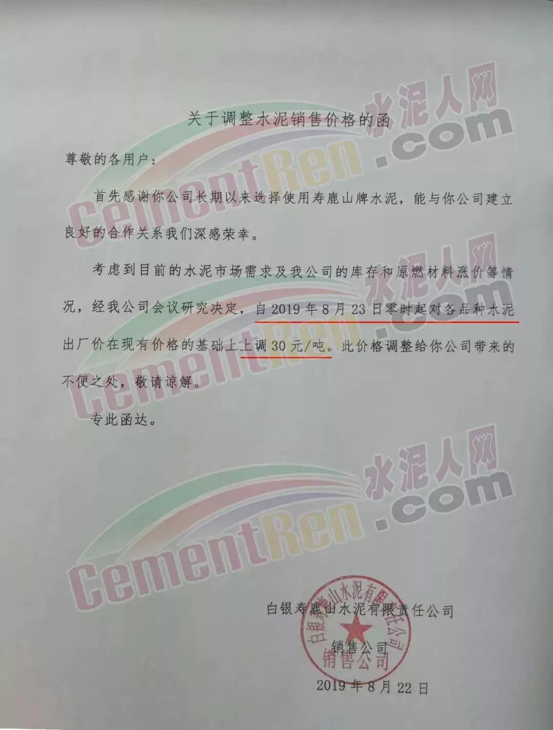根據(jù)當(dāng)前市場形勢經(jīng)我公司研究決定,自2019年08月22日上午9:00點(diǎn)起所有水泥品種價(jià)格統(tǒng)一上調(diào)30元/噸。