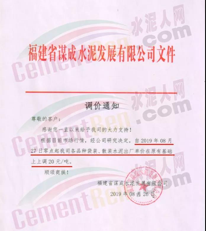 8月26日。福建省謀成水泥發(fā)展有限公司發(fā)布調(diào)價(jià)通知稱:根據(jù)目前市場行情,經(jīng)公司研究決定,自2019年8月27日零時(shí)起,我司各品種袋裝、散裝水泥出廠單價(jià)在原有基礎(chǔ)上上調(diào)20元/噸,本次調(diào)價(jià)為謀成水泥8月份的第二調(diào)價(jià),累計(jì)上調(diào)40元/噸。