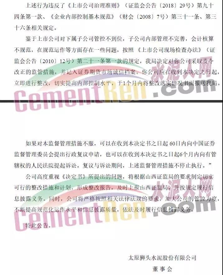 據(jù)證監(jiān)會網(wǎng)站消息,山西監(jiān)管局對太原獅頭水泥股份有限公司(簡稱ST獅頭)采取責令改正措施的決定。經(jīng)查,山西監(jiān)管局發(fā)現(xiàn)ST獅頭內(nèi)控方面存在以下違規(guī)行為: