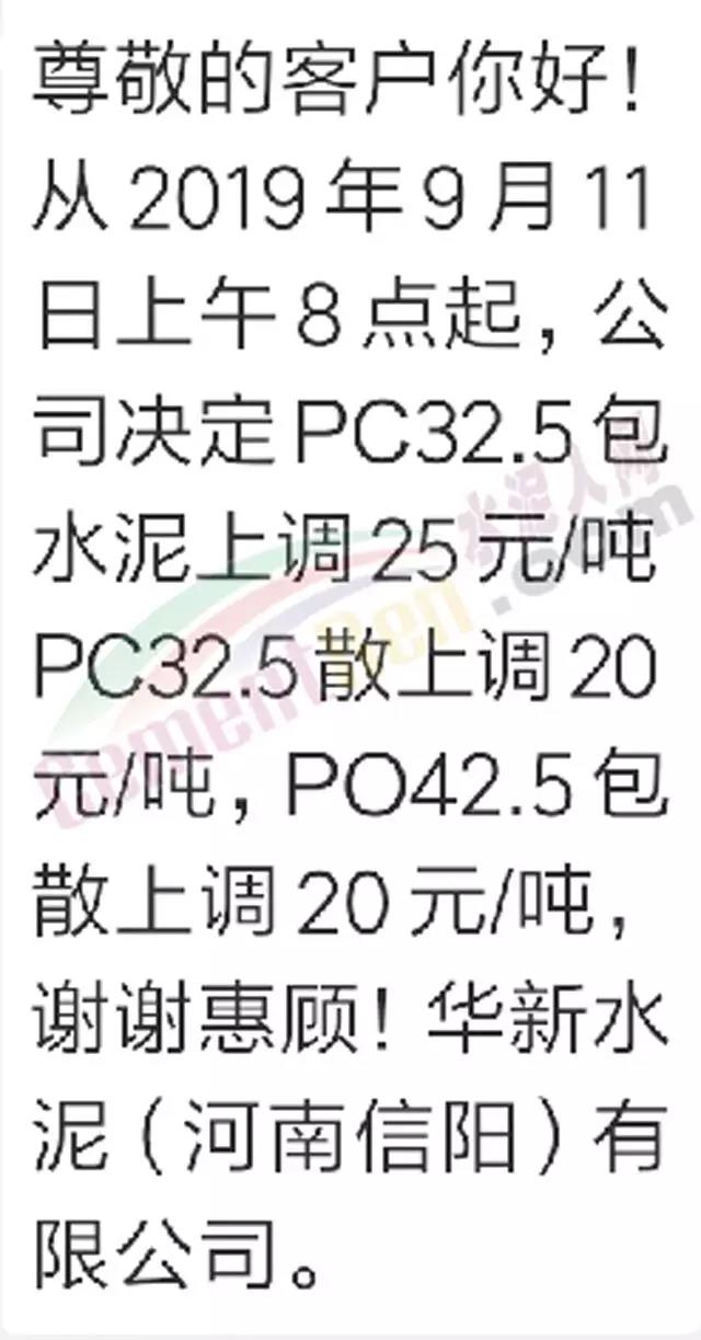 其中,華新水泥(河南信陽(yáng))有限公司11日發(fā)通知稱自9月11日上午8點(diǎn)起PC32.5包裝水泥價(jià)格上調(diào)25元/噸,散裝上 調(diào)20元/噸。PO42.5水泥(包散)上 調(diào)20元/噸。