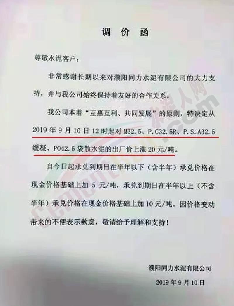 濮陽(yáng)同力水泥有限公司9月10日調(diào)價(jià)函稱,自9月10日12時(shí)起對(duì)旗下多個(gè)32.5級(jí)水泥及PO.42.5袋散水泥出廠價(jià)上調(diào)20元/噸。