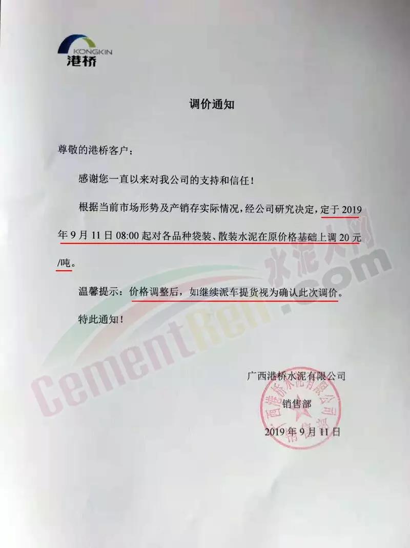 廣西港橋水泥有限公司銷售部調(diào)價(jià)通知稱定于9月11日8時(shí)起對(duì)各品種袋裝、散裝水泥在原價(jià)格基礎(chǔ)上上調(diào)20元/噸。