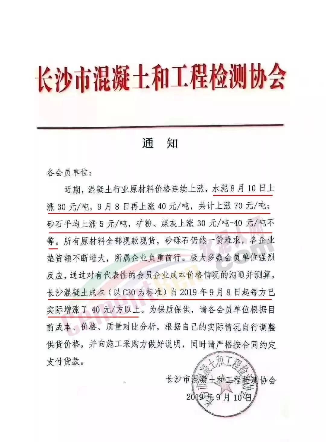 據(jù)水泥人網(wǎng)了解,本周二(17日)安徽六安地區(qū)混凝土行價(jià)格出現(xiàn)小幅上漲5元/方,市區(qū)主流品牌C30混凝土含稅非泵送價(jià)格在565-575元/方;湖南衡陽(yáng)原料價(jià)格上漲,混凝土隨之上浮5-10元/方,C30非泵市場(chǎng)報(bào)價(jià)415-435元/方。除上述區(qū)域外,近期華東區(qū)域混凝土價(jià)格亦出現(xiàn)小幅上漲,12日前后山東濱州、淄博以及安徽蕪湖及銅陵混凝土價(jià)格小幅上調(diào)5元/方;華中湖南長(zhǎng)沙部分區(qū)域上漲40元/方。詳情如下:日前,湖南省長(zhǎng)沙市混凝土和工程檢測(cè)協(xié)會(huì)發(fā)布通知稱(chēng),近期長(zhǎng)沙混凝土行業(yè)原材料價(jià)格連續(xù)上漲,水泥8月10日上漲30元/噸,9月8日再上漲40元/噸,共計(jì)上漲70元/噸;砂石平均上漲5元/噸,礦粉、煤灰上漲30-40元每噸不等。所有原材料全部現(xiàn)款現(xiàn)貨,砂礫石仍然一貨難求,各砼企墊資額不斷增大,所屬企業(yè)負(fù)重前行。經(jīng)大多數(shù)會(huì)員單位強(qiáng)烈反映,通過(guò)對(duì)有代表性的會(huì)員企業(yè)成本價(jià)格情況的溝通并測(cè)算,長(zhǎng)沙混凝土成本(以C30為標(biāo)準(zhǔn))自2019年9月8日起每方已實(shí)際增漲了40元以上。為了在保質(zhì)保量,建議各單位對(duì)目前成本,價(jià)格,質(zhì)量對(duì)比分析。根據(jù)自己的實(shí)際情況自行調(diào)整供貨價(jià)格,并向施工采購(gòu)方做好說(shuō)明,同時(shí)請(qǐng)嚴(yán)格按照合同約定支付貨款。