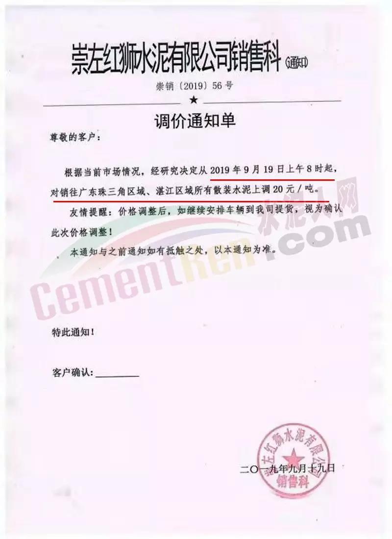 水泥人網(wǎng)消息:日前,崇左紅獅水泥銷(xiāo)售科通知:自今日(9月19日)上午8時(shí)起對(duì)銷(xiāo)往廣東珠三角、湛江區(qū)域區(qū)域所有散裝水泥上調(diào)20元/噸。