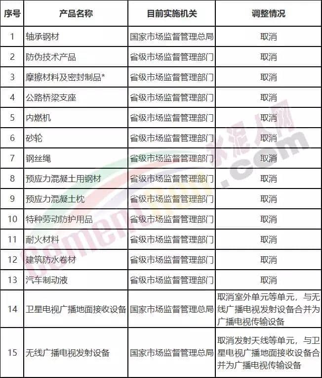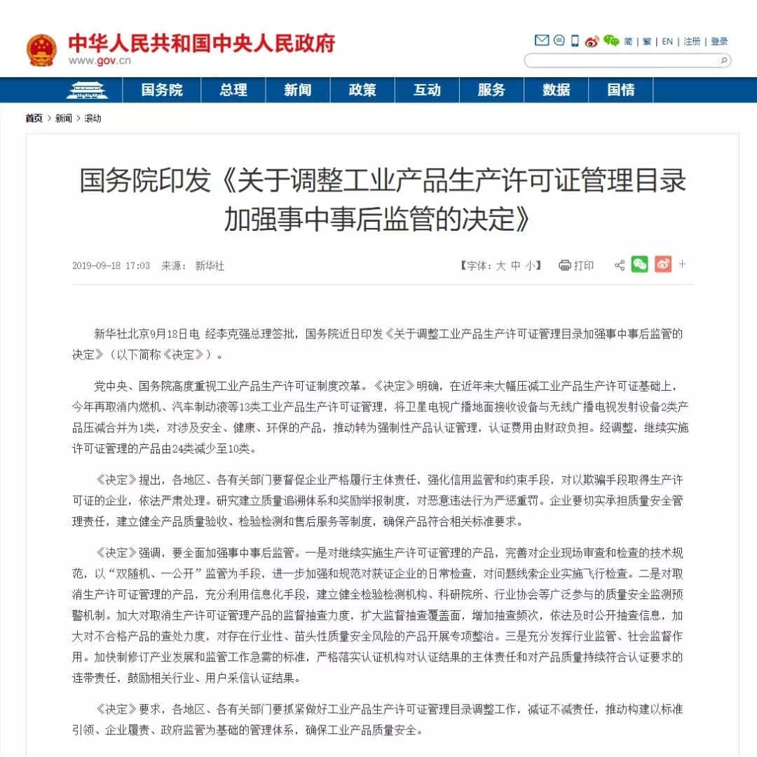 文件稱:黨中央、國務(wù)院高度重視工業(yè)產(chǎn)品生產(chǎn)許可證制度改革?!稕Q定》明確,在近年來大幅壓減工業(yè)產(chǎn)品生產(chǎn)許可證基礎(chǔ)上,今年再取消內(nèi)燃機(jī)、汽車制動液等13類工業(yè)產(chǎn)品生產(chǎn)許可證管理,將衛(wèi)星電視廣播地面接收設(shè)備與無線廣播電視發(fā)射設(shè)備2類產(chǎn)品壓減合并為1類,對涉及安全、健康、環(huán)保的產(chǎn)品,推動轉(zhuǎn)為強(qiáng)制性產(chǎn)品認(rèn)證管理,認(rèn)證費(fèi)用由財政負(fù)擔(dān)。經(jīng)調(diào)整,繼續(xù)實(shí)施許可證管理的產(chǎn)品由24類減少至10類?!稕Q定》提出,各地區(qū)、各有關(guān)部門要督促企業(yè)嚴(yán)格履行主體責(zé)任,強(qiáng)化信用監(jiān)管和約束手段,對以欺騙手段取得生產(chǎn)許可證的企業(yè),依法嚴(yán)肅處理。研究建立質(zhì)量追溯體系和獎勵舉報制度,對惡意違法行為嚴(yán)懲重罰。企業(yè)要切實(shí)承擔(dān)質(zhì)量安全管理責(zé)任,建立健全產(chǎn)品質(zhì)量驗(yàn)收、檢驗(yàn)檢測和售后服務(wù)等制度,確保產(chǎn)品符合相關(guān)標(biāo)準(zhǔn)要求?!稕Q定》強(qiáng)調(diào),要全面加強(qiáng)事中事后監(jiān)管。一是對繼續(xù)實(shí)施生產(chǎn)許可證管理的產(chǎn)品,完善對企業(yè)現(xiàn)場審查和檢查的技術(shù)規(guī)范,以“雙隨機(jī)、一公開”監(jiān)管為手段,進(jìn)一步加強(qiáng)和規(guī)范對獲證企業(yè)的日常檢查,對問題線索企業(yè)實(shí)施飛行檢查。二是對取消生產(chǎn)許可證管理的產(chǎn)品,充分利用信息化手段,建立健全檢驗(yàn)檢測機(jī)構(gòu)、科研院所、行業(yè)協(xié)會等廣泛參與的質(zhì)量安全監(jiān)測預(yù)警機(jī)制。加大對取消生產(chǎn)許可證管理產(chǎn)品的監(jiān)督抽查力度,擴(kuò)大監(jiān)督抽查覆蓋面,增加抽查頻次,依法及時公開抽查信息,加大對不合格產(chǎn)品的查處力度,對存在行業(yè)性、苗頭性質(zhì)量安全風(fēng)險的產(chǎn)品開展專項(xiàng)整治。三是充分發(fā)揮行業(yè)監(jiān)管、社會監(jiān)督作用。加快制修訂產(chǎn)業(yè)發(fā)展和監(jiān)管工作急需的標(biāo)準(zhǔn),嚴(yán)格落實(shí)認(rèn)證機(jī)構(gòu)對認(rèn)證結(jié)果的主體責(zé)任和對產(chǎn)品質(zhì)量持續(xù)符合認(rèn)證要求的連帶責(zé)任,鼓勵相關(guān)行業(yè)、用戶采信認(rèn)證結(jié)果。
