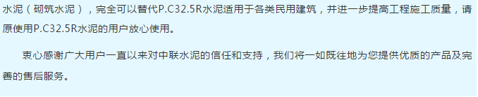 據(jù)水泥人網(wǎng)區(qū)域通知員反饋,繼西峽中聯(lián)水泥發(fā)布新品客戶(hù)告知書(shū)后,近日鄧州中聯(lián)水泥也發(fā)布了復(fù)合硅酸鹽42.5水泥客戶(hù)告知書(shū)以替代即將取消的PC32.5R水泥。鄧州中聯(lián)水泥客戶(hù)告知書(shū)如下: