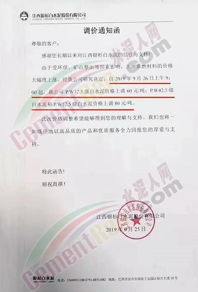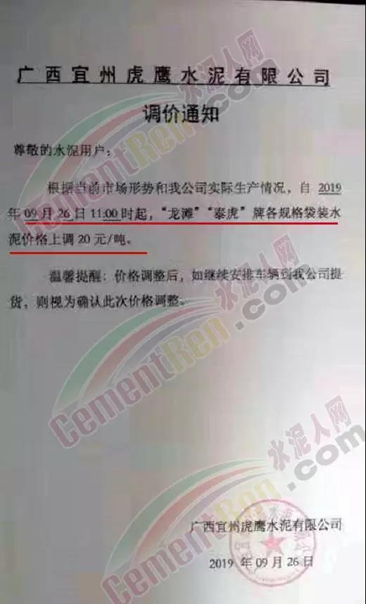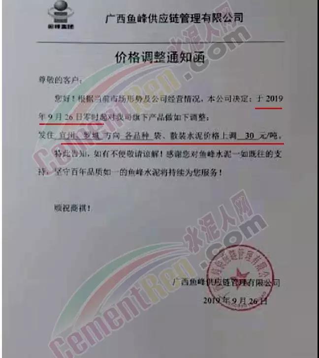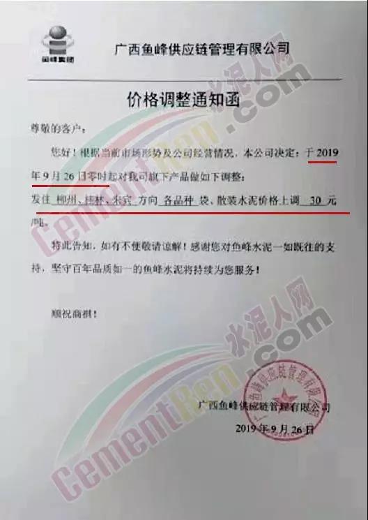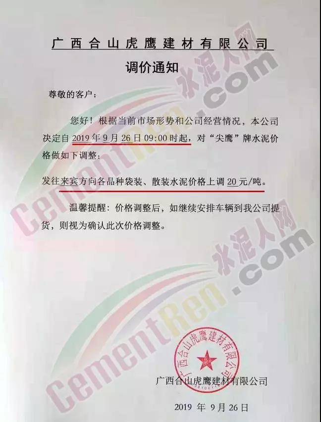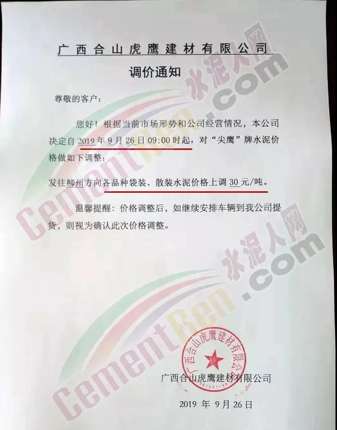 由于原材料價(jià)格上漲,公司經(jīng)營(yíng)成本上升,結(jié)合當(dāng)前市場(chǎng)行情變化,經(jīng)公司研究決定于2019年9月26日8:00開始對(duì)隆回區(qū)域各品種水泥價(jià)格上調(diào)30元/噸。