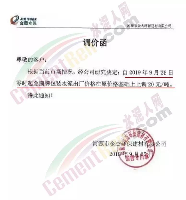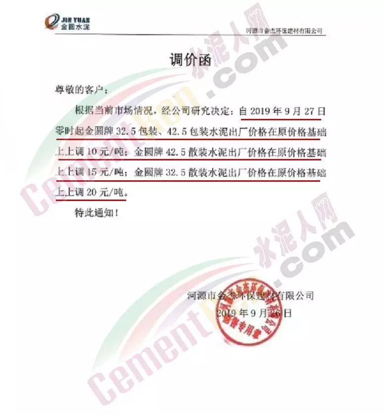 根據(jù)當(dāng)前市場(chǎng)形勢(shì)及我司生產(chǎn)情況,我公司決定于2019年9月26日8時(shí),上調(diào)所有品種袋裝、散裝水泥價(jià)格30元/噸。價(jià)格上調(diào)以我司出廠過磅時(shí)間為準(zhǔn),如您繼續(xù)安排提貨,則視為認(rèn)同此次價(jià)格調(diào)整。順祝商祺!