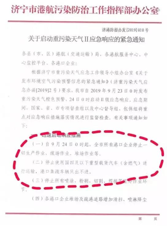 據(jù)水泥人網(wǎng)了解,近期北京、天津、河南、河北、山東、山西、江蘇、安徽均發(fā)布了橙色及以上重污染天氣預警。要求區(qū)域內(nèi)相關企業(yè)單位停工、停產(chǎn)、停運,同時要求相關港口停止作業(yè)。山東省多家港口企業(yè)停止作業(yè),港口集疏車輛只進不出。自9月24日起,濟寧市所有港口企業(yè)停止一切生產(chǎn)作業(yè)、煤場作業(yè)、堆場作業(yè),同時停止使用國四及以下重型載貨汽車(含燃氣)進行運輸,港口集疏車輛只進不出。