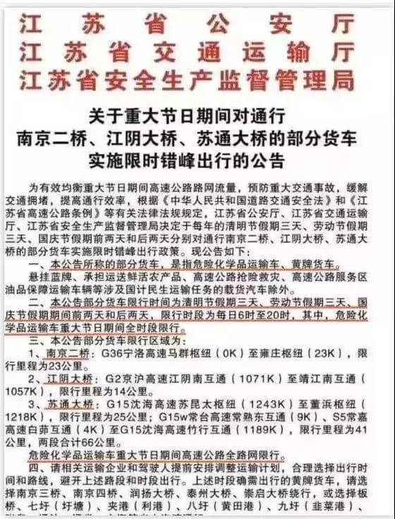 湖南?。喝〗形kU品車輛2019年10月1日0時至2019年10月8日6時,湖南全省高速公路禁止危險化學品運輸車輛通行。