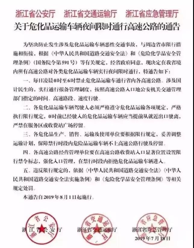 2019年8月1日起,每日0時至6時全省高速公路禁止危險化學品運輸車輛通行,其他時間段不限行。