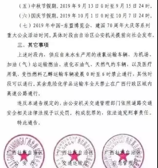 根據(jù)廣西壯族自治區(qū)公安廳、交通運輸廳、安全生產(chǎn)監(jiān)督管理局等聯(lián)合發(fā)布公告文件,2019年10月1日零時至10月7日24時,廣西壯族自治區(qū)全區(qū)域高速公路禁止危險貨物運輸車輛通行。物流停限,生產(chǎn)停限,嚴查超載,再加上時不時發(fā)生的交通事故,大載車司機的無奈只有自己才能體會。