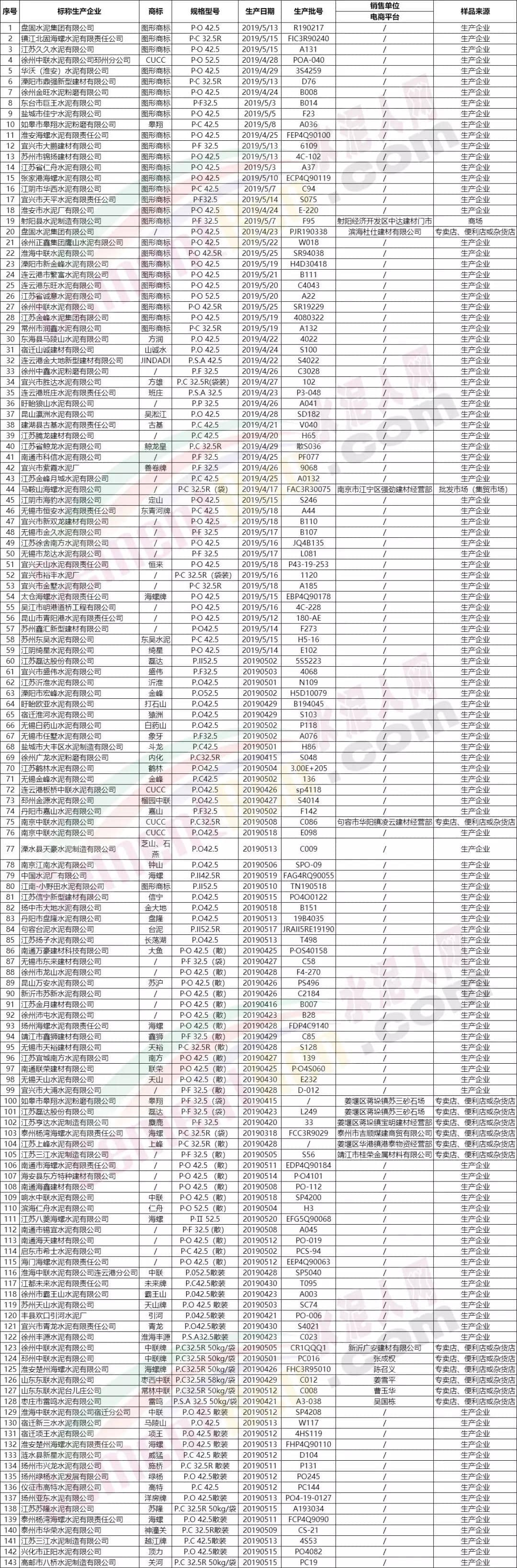 據(jù)通報(bào),2019年第二季度,省市場(chǎng)監(jiān)管局組織對(duì)建筑和裝飾裝修材料、農(nóng)業(yè)生產(chǎn)資料、機(jī)械及安防產(chǎn)品等3大類(lèi)29種產(chǎn)品質(zhì)量進(jìn)行了監(jiān)督抽查。共抽查產(chǎn)品2733批次,合格2481批次,平均合格率為90.8%。其中,在江蘇生產(chǎn)企業(yè)抽樣1162批次,合格1068批次,合格率為91.9%;在市場(chǎng)實(shí)體店購(gòu)樣1317批次,合格1212批次,合格率為92%;在電商平臺(tái)購(gòu)樣254批次,合格201批次,合格率為79.1%。建筑和裝飾裝修材料。抽查熱軋帶肋鋼筋、冷軋帶肋鋼筋、水泥、建筑防水涂料、建筑用鋼化玻璃、供水用塑料管材(PPR、PVC)、鋼筋混凝土排水管、鋁合金建筑型材、建筑保溫材料9種產(chǎn)品726批次,合格631批次,合格率為86.9%。其中,抽查產(chǎn)品150批次,合格146批次,合格率為97.3%。抽查不合格項(xiàng)目為強(qiáng)度、氯離子含量2項(xiàng)指標(biāo),有3批次產(chǎn)品的強(qiáng)度、2批次產(chǎn)品的氯離子含量項(xiàng)目不合格。不合格樣品的標(biāo)稱(chēng)生產(chǎn)企業(yè)涉及山東石榴園水泥有限公司、溧陽(yáng)金鵬特種水泥有限公司、溧陽(yáng)市金瀨水泥制造有限公司、徐州豐源水泥有限公司。水泥抽檢不合格名單
