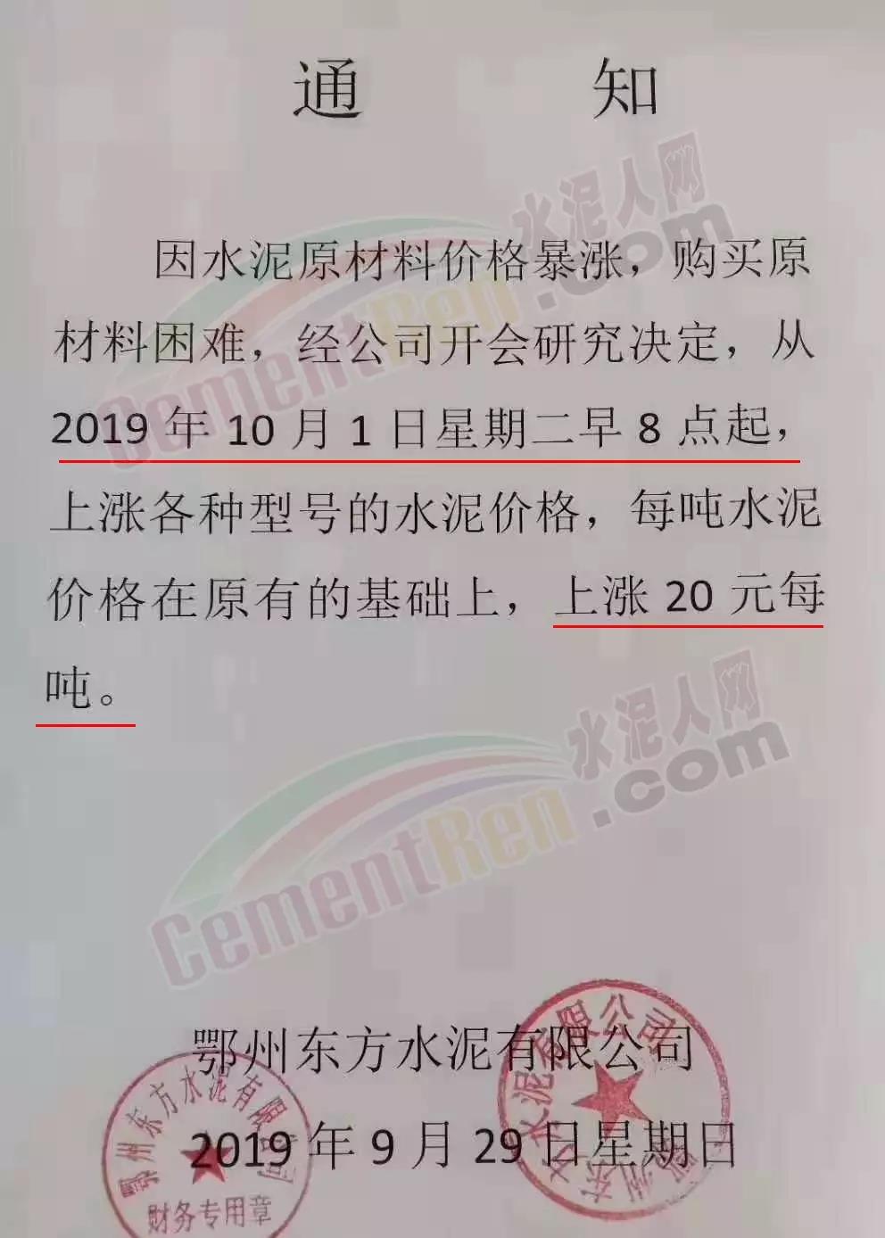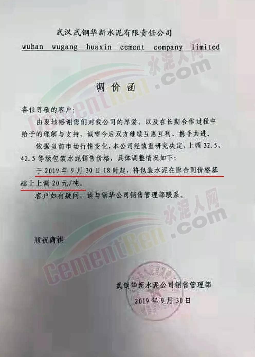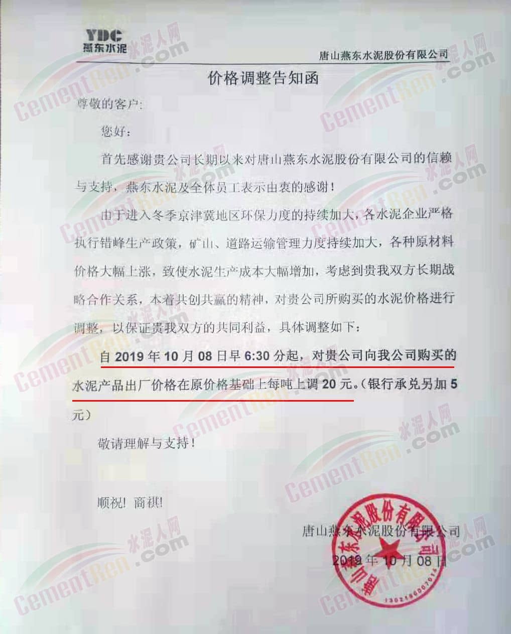 您好!感謝一直以來給予我公司的大力支持!因近期市場行情發(fā)生變化,為了公司的健康發(fā)展、保證產(chǎn)品和服務質(zhì)量,更好地加強貴我雙方的長期協(xié)作,經(jīng)我公司研究決定自2019年10月8日00:00時起,32.5R級別袋裝、散裝品種水泥出廠價在原基礎上上調(diào)30元/噸;42.5R級別袋裝、散裝品種水泥出廠價在原基礎上上調(diào)40元/噸;如您繼續(xù)安排車輛到我公司提貨,則視為您同意和確認此次價格調(diào)整,不便之處,敬請理解順頌商祺!
