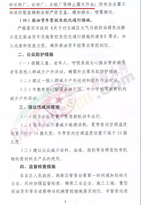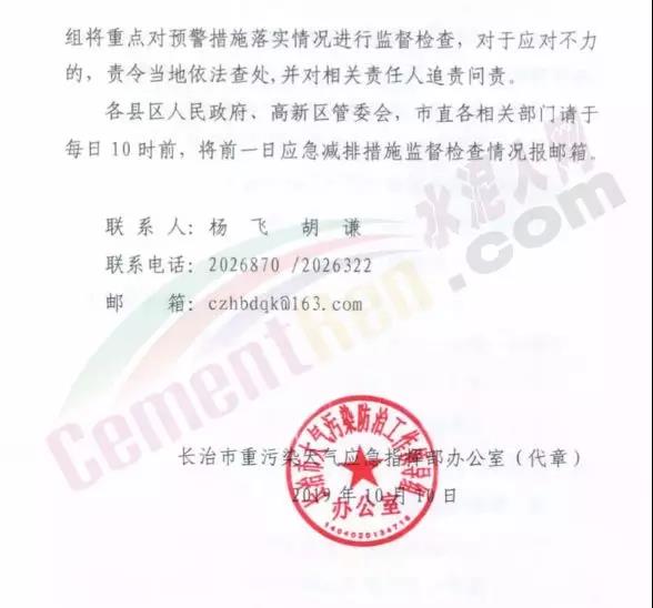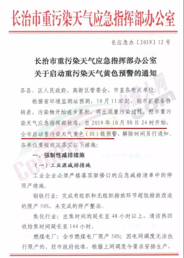 日前,長(zhǎng)治市重污染天氣應(yīng)急指揮部辦公室發(fā)布啟動(dòng)重污染天氣黃色預(yù)警的通知,要求自10月10日24時(shí)起,全市啟動(dòng) 重污染天氣黃色預(yù)警。要求轄區(qū)內(nèi)水泥行業(yè)停產(chǎn)、采石采砂行業(yè)停產(chǎn)、國(guó)四以下車輛禁運(yùn)、礦山、砂石料廠等停止作業(yè)。通知原文如下: