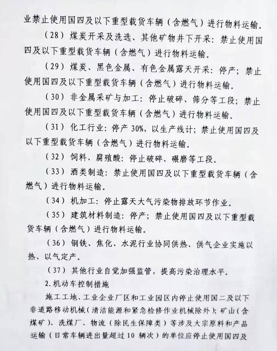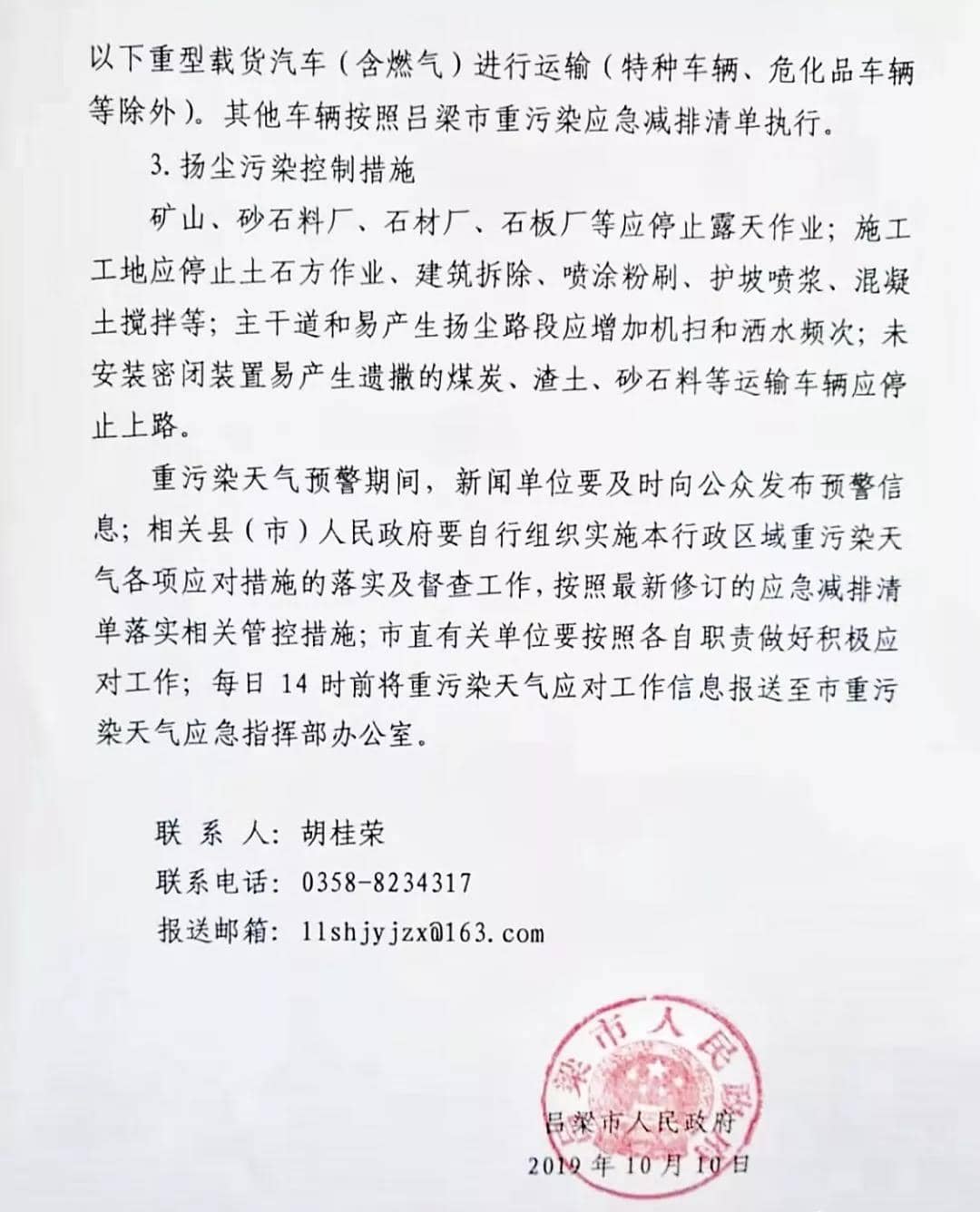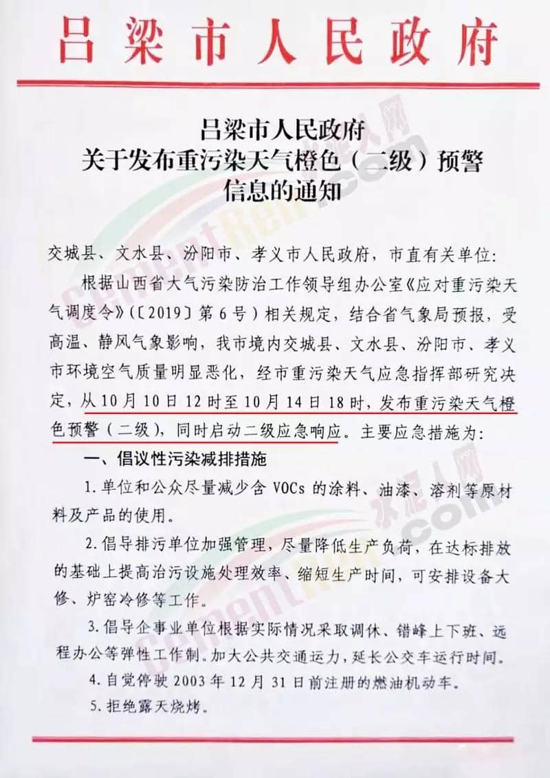 同期,呂梁市人民政策亦發(fā)布了重污染天氣橙色預(yù)警通知。通知稱自10月10日12時(shí)對(duì)10月14日18時(shí),發(fā)布重污染天氣橙色預(yù)警,同時(shí)啟動(dòng)二級(jí)應(yīng)急響應(yīng)。工業(yè)企業(yè)強(qiáng)制減排措施要求水泥:水泥制品、粉磨站停產(chǎn);禁止使用國(guó)四及以下重型載貨車輛進(jìn)行物料運(yùn)輸。水泥熟料生產(chǎn)線停產(chǎn),協(xié)同處置城市 生活垃圾或危廢的企業(yè),日處理生活垃圾與污泥總量低于400噸、處理危廢總量低于熟料產(chǎn)能4%的生產(chǎn)線停產(chǎn)。通知全文如下: