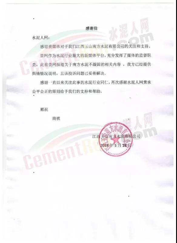 此前,湖南玉山水泥也發(fā)來(lái)《感謝信》稱,感謝水泥人網(wǎng)對(duì)于江西玉山南方水泥有限公司的關(guān)注和支持。水泥人網(wǎng)作為行業(yè)中最大的新媒體平臺(tái),充分發(fā)揮了媒體的監(jiān)督職責(zé),此前水泥人網(wǎng)報(bào)道的關(guān)于南方水泥不凝固的相關(guān)內(nèi)容,江西玉山南方水泥已經(jīng)妥善解決。