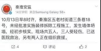 10月13日上午8時(shí)許,南京市秦淮區(qū)一棟建筑發(fā)生墻體坍塌。據(jù)秦淮安監(jiān)通報(bào),現(xiàn)場共5人,3人受輕傷。