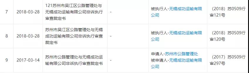 據(jù)公開(kāi)信息顯示,從2017年至2019年近3年時(shí)間內(nèi),無(wú)錫成功運(yùn)輸有限公司至少涉及9起法律訴訟。案由涵蓋“機(jī)動(dòng)車交通事故責(zé)任糾紛”“違反《公路安全保護(hù)條例》第六十四條”等。