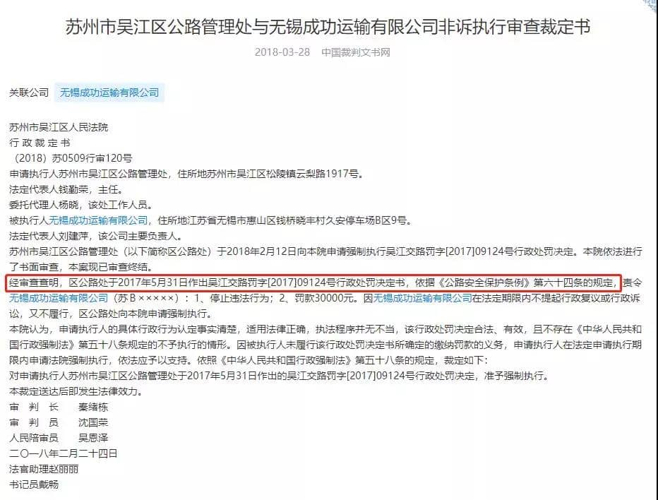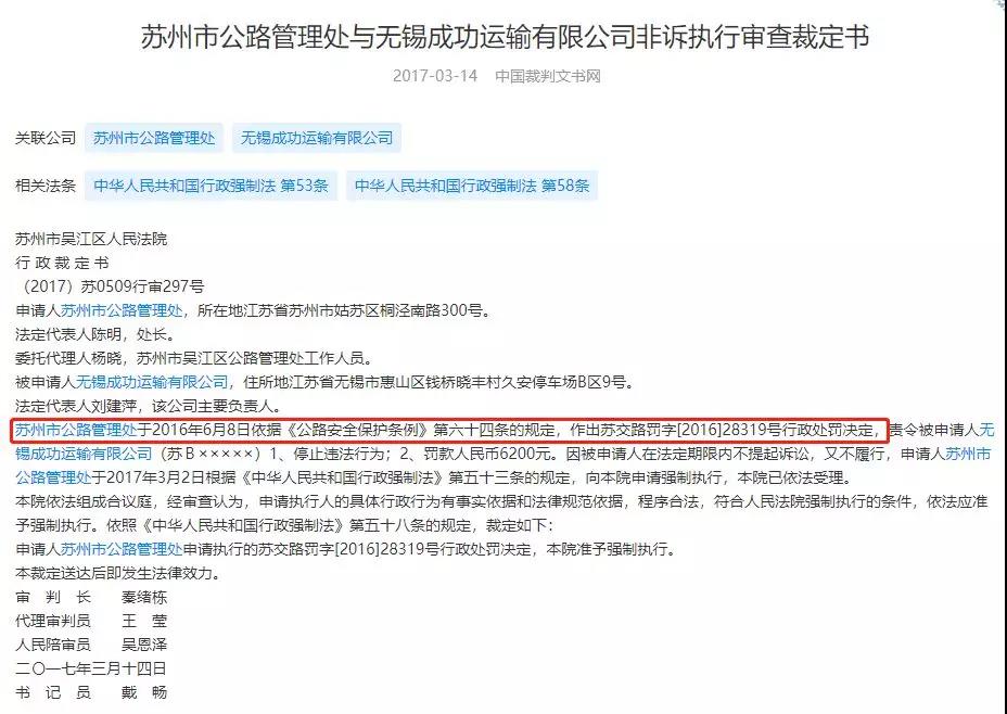 其中,在2016年6月8日至2017年5月31日期間,由于違反《公路安全保護(hù)條例》第六十四條,被蘇州市吳江區(qū)公路管理局審查裁定。