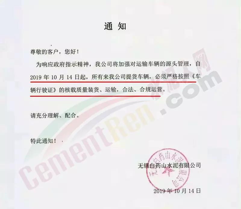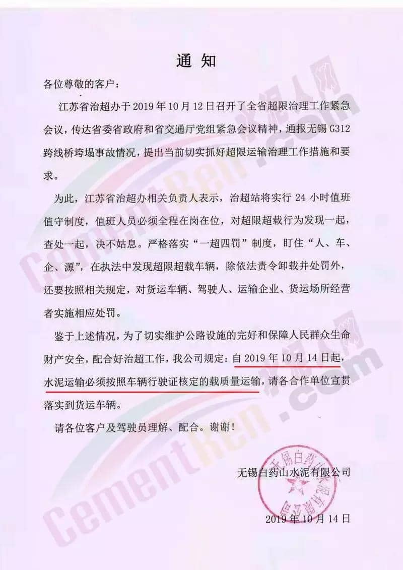 水泥人網(wǎng)消息:近日,多區(qū)域啟動了針對物流超限的重點整治。日前, 無錫白藥山水泥有限公司發(fā)布通知稱:江蘇省治超辦相關負責人表示,治超站將實行24小時值班值守制度,值班人員全程在崗在位,對超限超載行為發(fā)現(xiàn)一起,查處一起,決不姑息。嚴格落實“一超四罰”制度,盯住“人、車、企、源”,在執(zhí)法中發(fā)現(xiàn)超限超載車輛,除依法責令卸載并處罰處,還要按照相關規(guī)定,對貨運車輛、駕駛人、運輸企業(yè)、貨運場所經(jīng)營者實施相應處罰。鑒于上述情況,為了節(jié)實維護公路設施的完好和保障人民群眾生命財產安全,配合好治超工作。公司規(guī)定自10月14日起,水泥運輸車必須按照車輛行駛證核定的載質量運輸。并請各合作單位 宣貫落實到貨運車輛 。