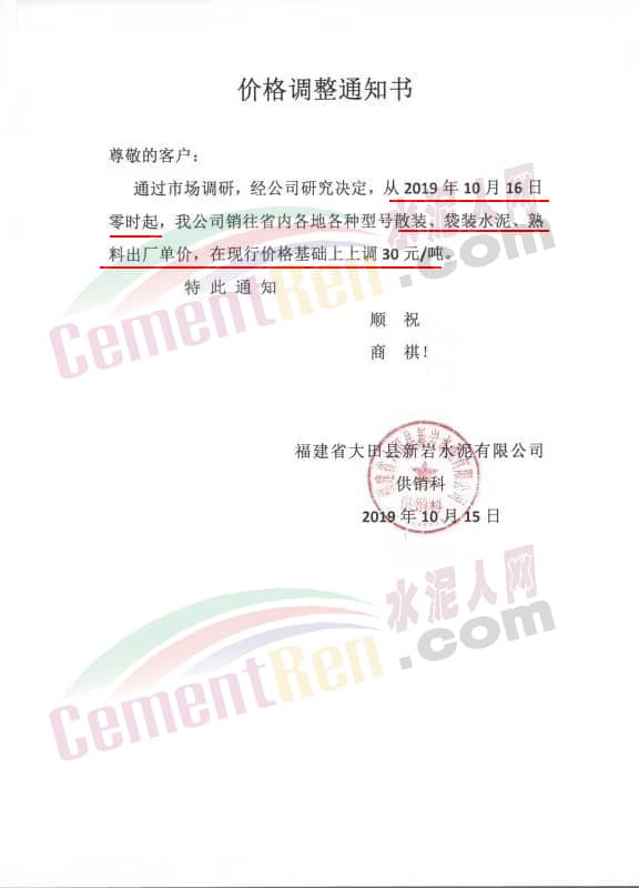 福建省大田縣新巖水泥有限公司供銷科價格調整通知書稱,從今日(16日)零時起,銷往省內各地各種型號散裝、袋裝水泥、熟料出廠單價在現(xiàn)行基礎上上調30元/噸。