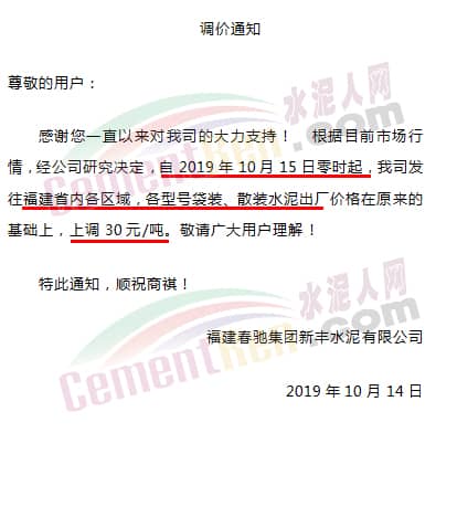福建春馳集團新豐水泥有限公司通知自15日零時起上調福建省內各區(qū)域 ,各型號袋、散裝水泥出廠價格,上調