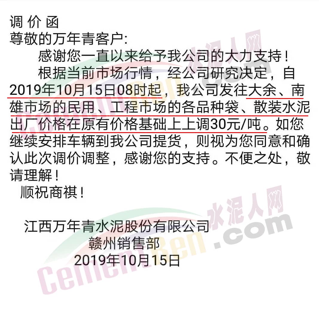 江西萬年青水泥股份有限公司贛州銷售部通知稱自15日8時起,公司發(fā)往大余、南雄市的民用、工程市場的各品種袋、散裝水泥出廠價格在原有價格基礎上上調30元/噸。